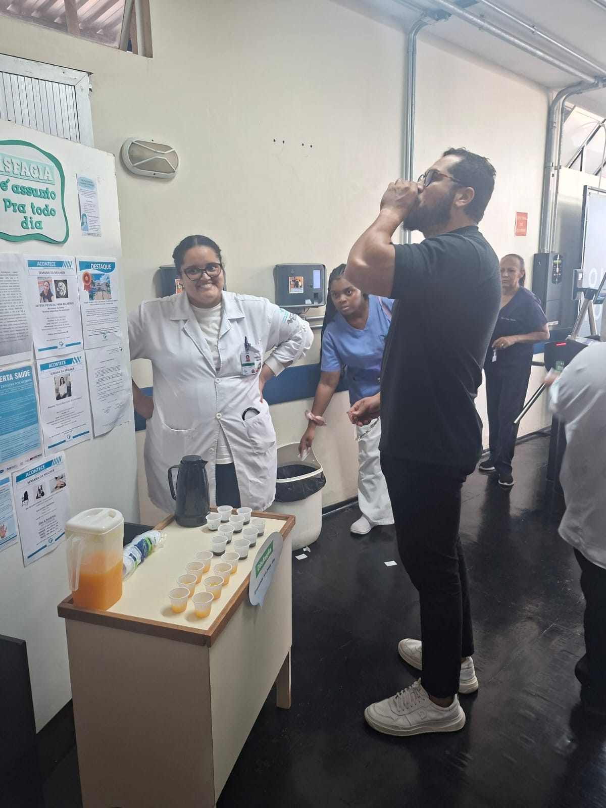 Além das abordagens informativas, a programação incluiu um momento de degustação de bebidas espessadas, como café e suco, realizado na Portaria 3. A proposta foi proporcionar aos profissionais uma experiência prática, favorecendo a compreensão das adaptações necessárias na alimentação de pacientes com disfagia.